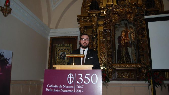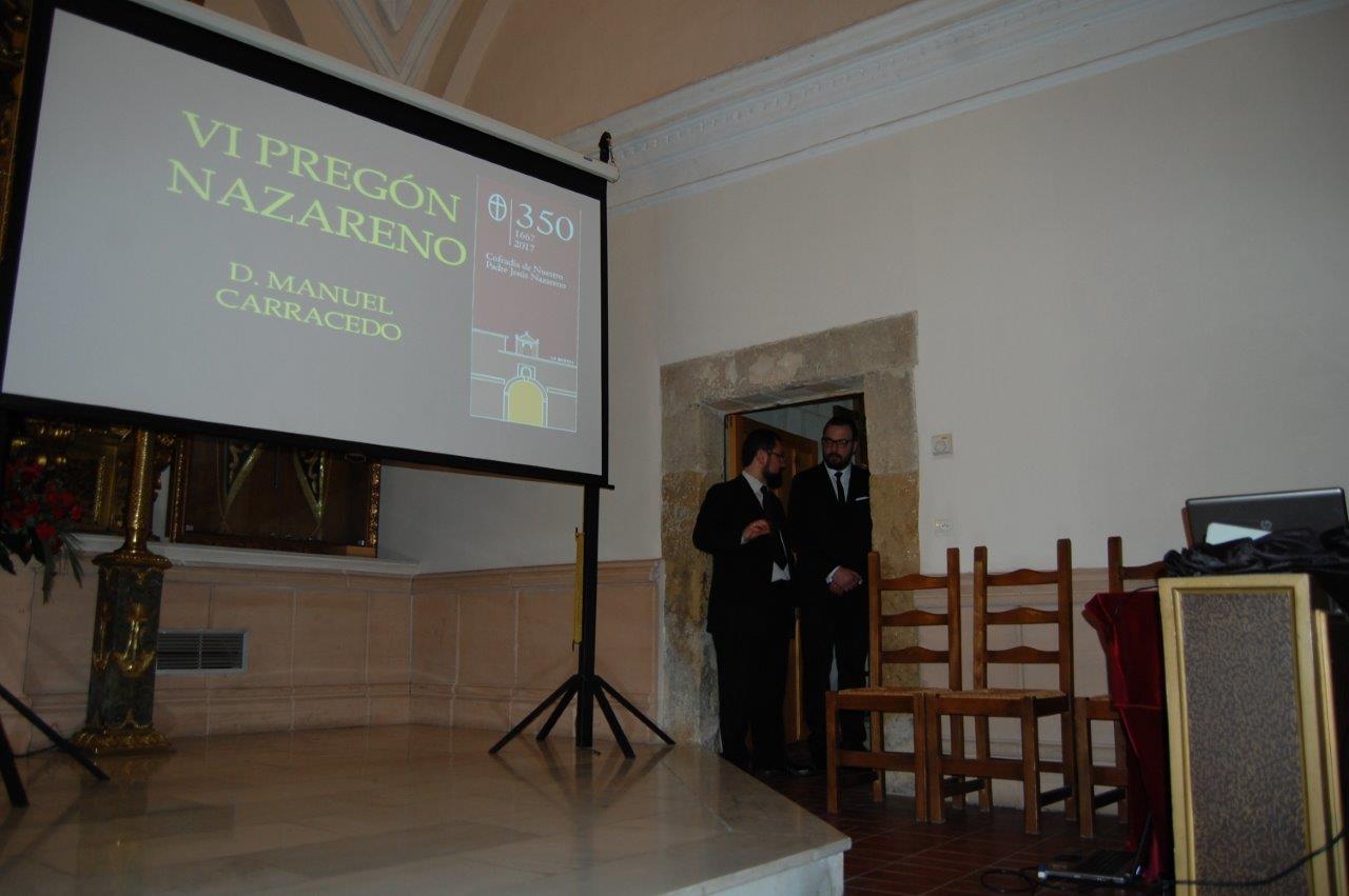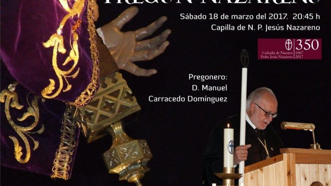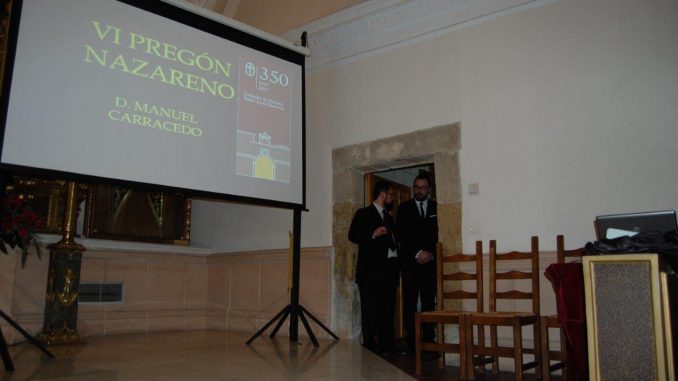 Manuel Carracedo Domínguez miembro del “Cavido” y Tesorero de la Cofradía, fue el encargado del VI pregón Nazareno. Como gran conocedor de todo lo relacionado con la Cofradía, hizo un recorrido de sus muchas vivencias a lo largo de los 45 años que lleva en el “Cavildo”, desde las gestiones para la adquisición y restauración del patrimonio imaginero, hasta dirigir el Santo Rezo de la Procesión del Calvario y colaborando en las múltiples actividades que realiza la Cofradía, no solo en la Semana Santa, sino durante todo el año.